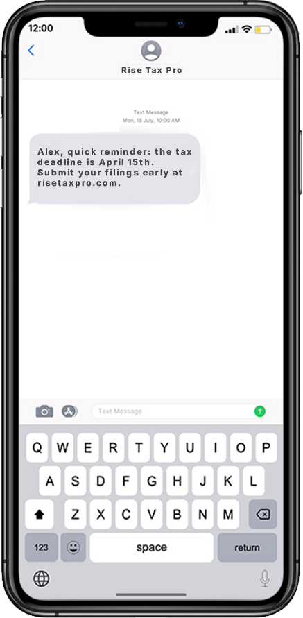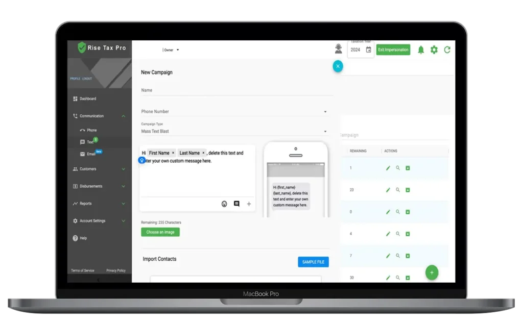 Connect with your clients effortlessly using mobile text messages for promotions, sales, announcements, and notifications. Whether it’s one-on-one or a mass campaign, Rise Tax Pro makes communication simple, effective, and professional.